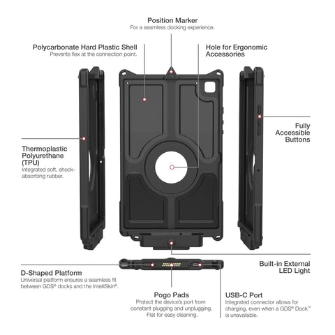 The IntelliSkin® Next Generation protective sleeve for the Samsung Galaxy Tab A7 10.4 (SM-T500) includes all the great features of the original IntelliSkin® while adding several enhancements. An insert molded redesign of the skin combines a hard plastic shell with soft, shock-absorbing rubber. Ruggedized contacts for repetitive docking in field applications remain on the exterior, but are now flat to collect less dirt and allow for easier cleaning. And an integrated USB Type-C connector at the bottom of the skin allows for device charging even when you don’t have a GDS® Dock™ available. This variation also integrates a powerful LED light in the back of the IntelliSkin® with an on/off button on the front. Like the original IntelliSkin®, these sleeves still provide military-grade drop protection and prevent damage to your device’s charging port from constant docking with an integrated GDS® connector molded directly into the skin. The IntelliSkin® Next Generation for the Samsung Galaxy Tab A7 10.4 (SM-T500) is compatible with a variety of GDS® Docks™ and accessories, as well as new docking cups for upgrading existing GDS® vehicle docks. Always Protected. Always Connected.®