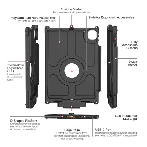 The IntelliSkin® Next Generation protective sleeve for the Apple iPad Pro 11" (1st - 4th Gen), iPad Air 4, 5 & Air 11 (M2) includes all the great features of the original IntelliSkin® while adding several enhancements. An insert molded redesign of the skin combines a hard plastic shell with soft, shock-absorbing rubber. Ruggedized contacts for repetitive docking in field applications remain on the exterior, but are now flat to collect less dirt and allow for easier cleaning. And an integrated USB Type-C connector at the bottom of the skin allows for device charging even when you don’t have a GDS® Dock™ available. This variation also integrates a powerful LED light in the back of the IntelliSkin® with an on/off button on the front. Like the original IntelliSkin®, these sleeves still provide military-grade drop protection and prevent damage to your device’s charging port from constant docking with an integrated GDS® connector molded directly into the skin. The IntelliSkin® Next Generation for the Apple iPad Air (4th & 5th Gen) & iPad Pro 11" (1st - 4th Gen) is compatible with a variety of GDS® Docks™ and accessories, as well as new docking cups for upgrading existing GDS® vehicle docks. Always Protected. Always Connected.®