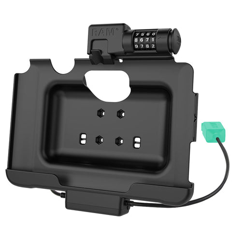 This RAM® EZ-Roll’r™ power cradle for the Samsung Galaxy Tab Active4 Pro and Tab Active Pro has been designed to meet the demands of field workers in a variety of applications including transportation, field sales, logistics, manufacturing, and much more. Power and data sync capabilities are provided to the device through GDS® pogo pins while taking advantage of this cradle's dual USB-A port supporting up to two peripherals making this the ideal, compact mounting solution for your mobile workstation. For security and theft deterrence, this powered cradle features a combination lock. Access to the stylus remains while the device is docked. Included is a set of four nuts and bolts to connect the cradle to any RAM® components containing the universal 4-hole AMPS pattern. This cradle also contains space in the back allowing for a GDS® Hand-Stand™ attachment so you can easily take your Galaxy Tab Active4 Pro and Tab Active Pro from your vehicle, to your person, to your desk with zero hassle.