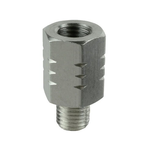 The RAM® M10-1.25 Reverse Thread Adapter (RAM-M10125-RTA) raises the mirror connection point on motorcycles by 20mm. The reverse thread adapter typically installs on the rider's right mirror connection point. This is done to ensure that if your mirror is hit while riding, the connected accessory is twisted loose rather than redirecting your vehicle's direction.